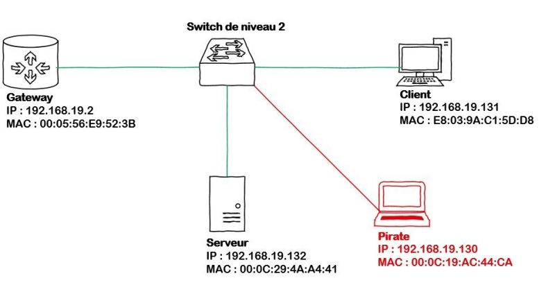 Le principe de l’ARP ou du MAC spoofing (spoofing voulant dire “parodier”, “usurper”) est d’envoyer des informations à un système afin de lui faire enregistrer des informations qui ne sont pas les bonnes et qui usurpent l’identité (la relation IP-MAC) d’un autre système. Partons du schéma suivant :
