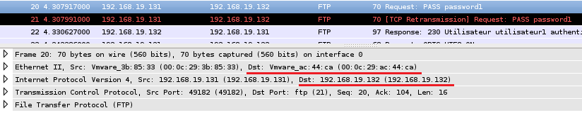 On voit donc que les identifiants FTP passent par notre pirate alors que, normalement ils ne doivent pas y transiter, mais si l'on observe l’entête Ethernet de ces paquets FTP :