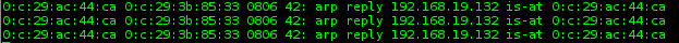 On remarque l’envoi de paquet ARP reply indiquant que l’IP du serveur (192.168.19.132) a maintenant l’adresse MAC du pirate (00:c:29:ac:44:ca), il s'agit ici d'une donnée qui est fausse et falsifiée par l'action du pirate.