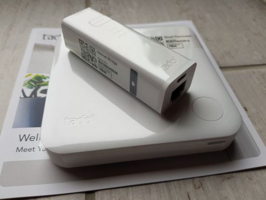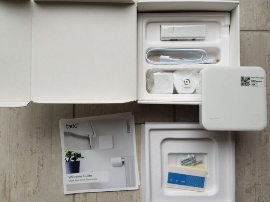 Ce kit de démarrage contient une passerelle Tado°, un thermostat intelligent et ses accessoires, ce qui nous donne :