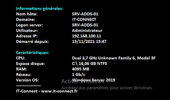 Informations générales: Nom hôte: <Host Name> Domaine: <Logon Domain> Logon server: <Logon Server> Utilisateur: <User Name> Adresse IP: <IP Address> Démarré depuis: <Boot Time> Caractéristiques: CPU: <CPU> Espace disque: <Free Space> RAM: <Memory> Réseau: <Network Speed> Version OS: <OS Version> ----------------- IT-Connect - www.it-connect.fr