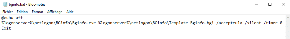 Dans ce dossier, nous allons ajouter également un script Batch qui va permettre d'exécuter BgInfo à l'ouverture de session, en utilisant notre modèle. On peut aussi trouver une alternative en PowerShell, mais pour lancer un simple exécutable, un script Batch c'est léger et efficace.