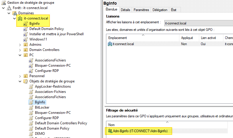 Par contre quand on enlève un utilisateur du groupe « Adm-Bginfo » de l’Active Directory, les informations de BGinfo restent affichées sur le poste de l’utilisateur. Vous auriez une petite idée ?