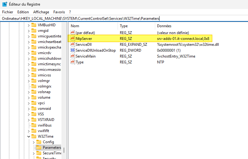 Si vous souhaitez vérifier dans le registre que votre liste de serveur(s) NTP est prise en charge, parcourez-le jusqu'à la clé suivante :