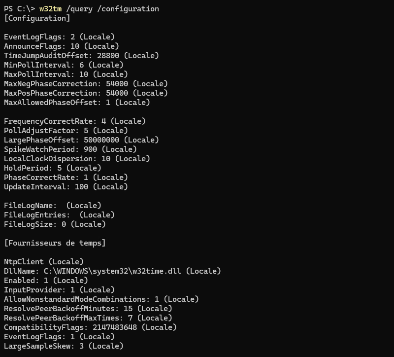 Pour obtenir la configuration détaillée et complète du service w32time, vous devez utiliser cette commande :