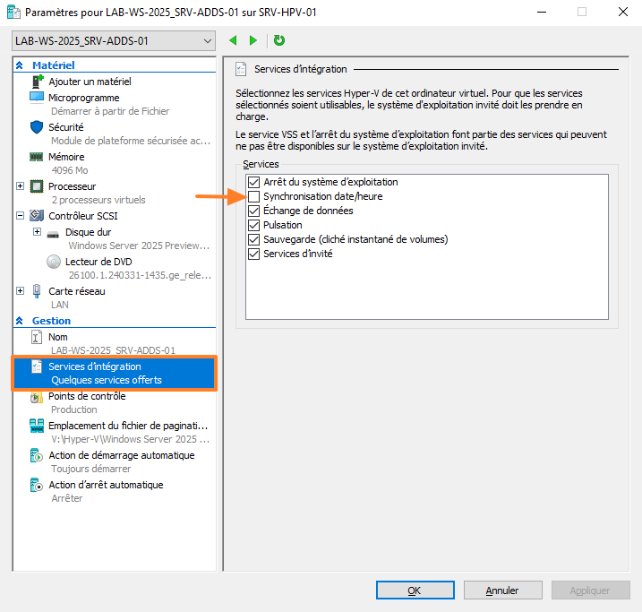 Certains hyperviseurs, comme Hyper-V, intègrent une option pour fournir l'heure aux invités (machines virtuelles) via un service dédié. C'est le cas des machines virtuelles Hyper-V où l'option "Synchronisation date/heure" visible dans les paramètres des services d'intégration est activée par défaut. Ainsi, la machine virtuelle va synchroniser son horloge avec le serveur Hyper-V, plutôt qu'avec une autre source de temps.