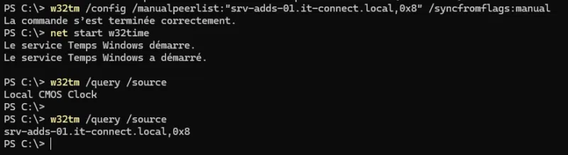 w32tm /config /manualpeerlist:"srv-adds-01.it-connect.local,0x8, 1.fr.pool.ntp.org,0x8" /syncfromflags:manual