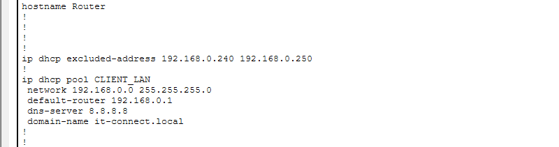 Comme je le disais précédemment, le routeur Cisco va distribuer toutes les adresses disponibles sur le réseau spécifié. Il peut donc s'avérer judicieux d'effectuer une exclusion d'adresses IP que nous ne souhaitons pas distribuer. Nous devons quitter le mode actuel pour retourner en mode configuration afin d'effectuer cette modification. Par exemple, ici, nous allons exclure les adresses IP de 192.168.0.240 à 192.168.0.250 :