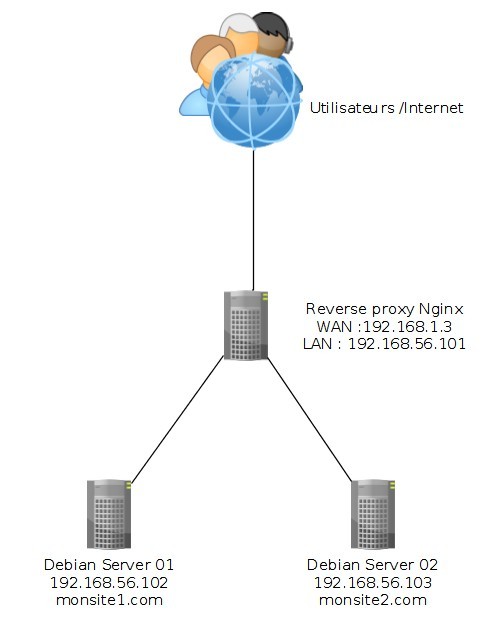 Bref, le rôle du proxy est important mais nous ne traiterons pas tous ces sujets dans cet article. Nous allons nous contenter de mettre en place un reverse proxy sous Nginx, celui-ci agira en tant que RP pour deux sites web, situés sur deux serveurs web distincts, exactement comme sur le schéma indiqué plus haut.