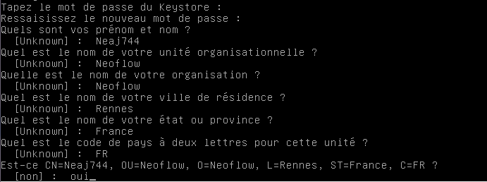 Vous aurez alors à répondre à plusieurs questions afin de remplir votre Keystore :