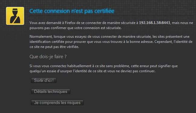 Nous voyons que nous avons accès en HTTP à notre serveur. Testons maintenant un accès HTTPS par le port standard (défini dans le fichier de configuration) : https://<ip_serveur>:8443