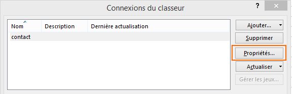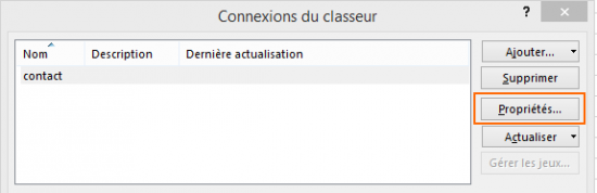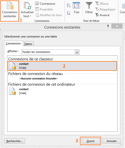 Maintenant, en cliquant sur "Connexions existantes" on va ouvrir notre connexion. Dans la liste, sélectionnez "contact" et cliquez sur "Ouvrir".
