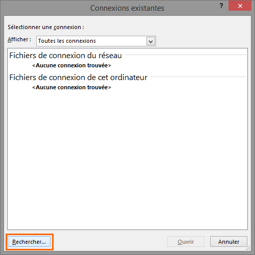 Aucune liaison existante n'est intégrée dans ce document Excel, il faut donc cliquer sur "Rechercher".