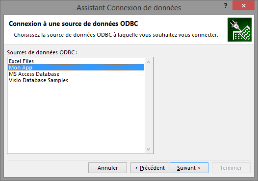On sélectionne la source de données "Mon App" que nous avions créé précédemment. Cliquez sur "Suivant".