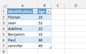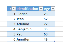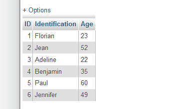 Dans cette table, on trouve trois champs : ID, Identification et Age. L'objectif est d'identifier rapidement des personnes avec un numéro unique, un prénom et l'âge.