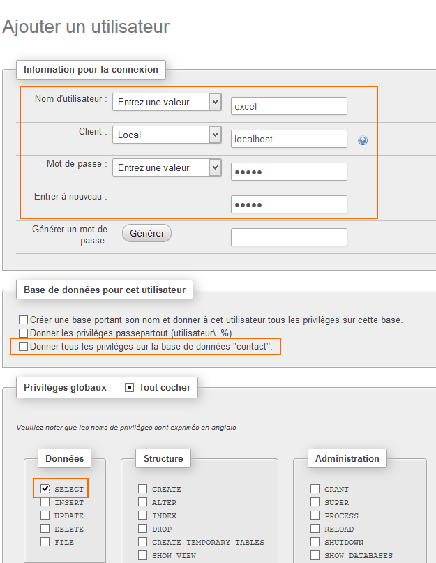 Nous n'allons pas connecter Excel à MySQL en utilisant l'utilisateur "root" (ne me dite pas que vous y avez pensé !), c'est une précaution importante à prendre en matière de sécurité. Un utilisateur spécifique sera créé en lui donnant uniquement des droits de lecture sur la base de données "contact".