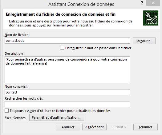 Enfin, validez en cliquant sur "Terminer". Il faut savoir qu'un fichier "contact.odc" sera créé sur la machine, c'est le fichier de configuration de la connexion. Il peut être exporté et copié sur une autre machine où vous souhaitez utiliser cette connexion, cela évite de refaire une partie de la configuration.