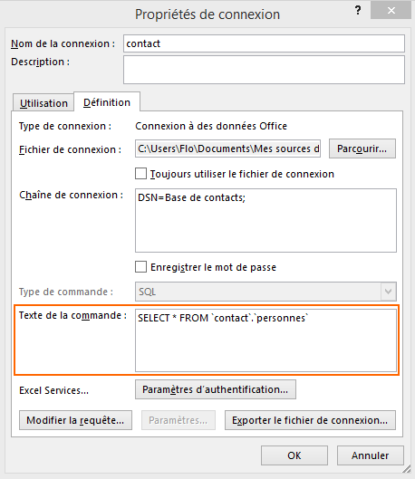 Dans l'onglet "Définition", il faudra modifier la requête SQL qui se trouve dans la zone "Texte de la commande" comme ceci (sur la copie d'écran la requête par défaut est affichée) :