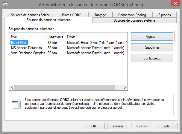 Un assistant s'ouvre... Dans l'onglet "Sources de données utilisateur" cliquez sur "Ajouter" sur la droite.