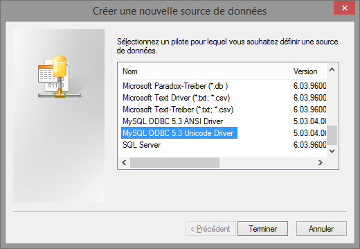Dans la liste, vous devez trouver le driver ODBC pour MySQL que nous venons d'installer. Préférez l'utilisation de la version Unicode pour les applications plus récentes. Cliquez sur "Terminer".