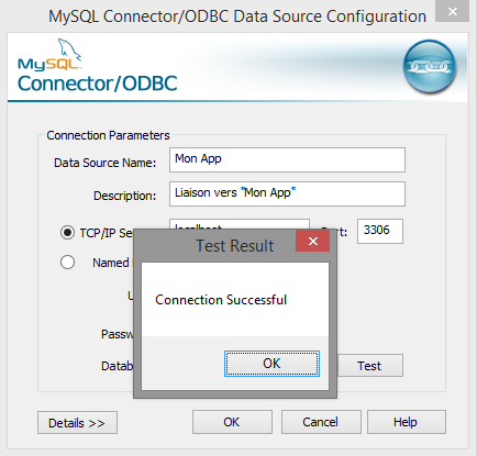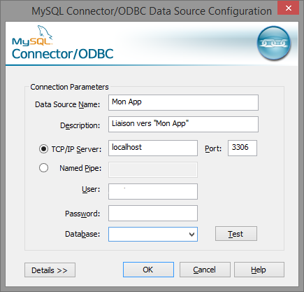 Ensuite, on doit nommer la source de données (exemple : Mon App) et remplir les paramètres de connexion au serveur MySQL. Indiquez l'adresse IP ou le nom pour joindre le serveur, pour ma part c'est du local donc localhost. Le port 3306 n'a pas besoin d'être changé sauf si vous l'avez modifié dans la configuration de MySQL.