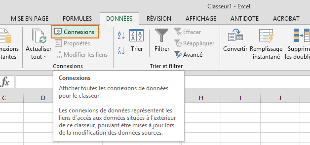 La connexion ODBC est prête, le serveur MySQL également, il ne reste plus qu'à connecter Excel. Ouvrez un nouveau document Excel, et dans l'onglet "Données" cliquez sur "Connexion" :