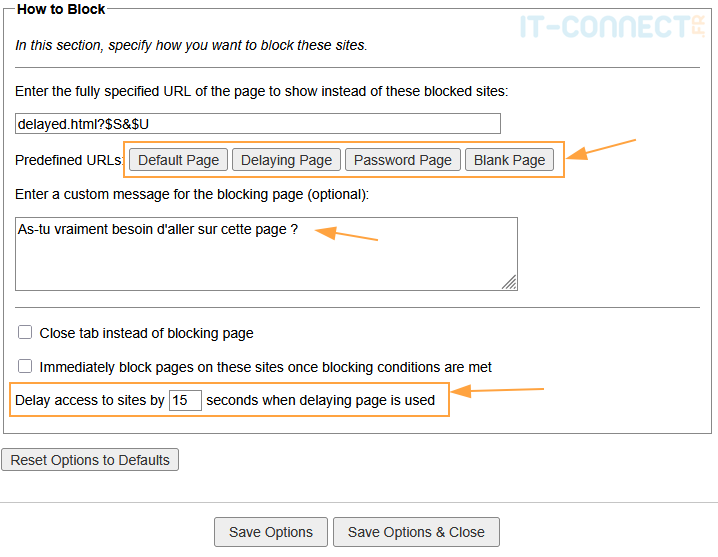 Pour ma part, je préfère la restriction qui affiche une page de chargement intermédiaire. Je trouve qu’elle est la plus efficace, car l’attente (configurée dans mon cas à 15 secondes) me suffit à me dire “je n’ai vraiment pas besoin de me rendre sur cette page” et résulte dans 90% des cas à une fermeture de la page avant d’atteindre le site en question.