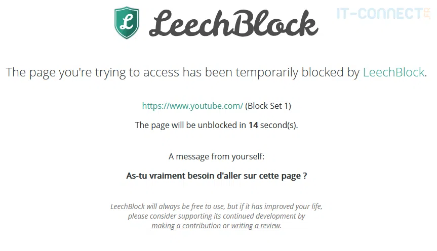 Pour ma part, je préfère la restriction qui affiche une page de chargement intermédiaire. Je trouve qu’elle est la plus efficace, car l’attente (configurée dans mon cas à 15 secondes) me suffit à me dire “je n’ai vraiment pas besoin de me rendre sur cette page” et résulte dans 90% des cas à une fermeture de la page avant d’atteindre le site en question.