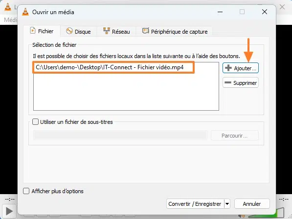 Dans la zone "Sélection de fichier", il faut cliquer sur le bouton "Ajouter" pour indiquer le fichier que l'on souhaite convertir. Il est possible de convertir des fichiers en masse avec VLC, c'est-à-dire plusieurs fichiers en une seule fois. Cela peut s'avérer très pratique.