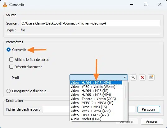 Ensuite, veillez à choisir l'option "Convertir", puis sélectionnez le profil pour votre fichier de sortie, c'est-à-dire son format. Il y a une liste prédéfinie de profils, mais vous pouvez créer un profil personnalisé. Veillez à définir un emplacement et un nom pour le fichier de sortie, en cliquant sur le bouton "Parcourir".