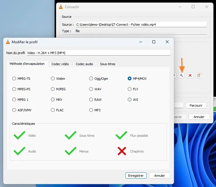 Vous pouvez choisir la méthode d'encapsulation, ce qui correspond au format du fichier de sortie (MP4, MPEG, MKV, FLV, WAV, AVI, etc.), ainsi que les codecs vidéo et audio, selon vos besoins. Pour ma part, il m'arrive souvent de convertir des fichiers MKV au format MP4 dans le cadre des montages vidéos. Si vous travaillez avec de l'audio, vous pouvez convertir du MP3 au FLAC ou inversement, le tout avec VLC.