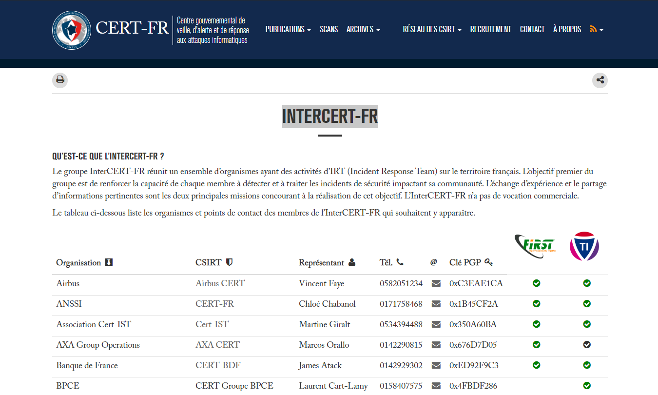 La liste des CERT mandatés par l'ANSSI peut être consultée sur son site web : INTERCERT-FR.