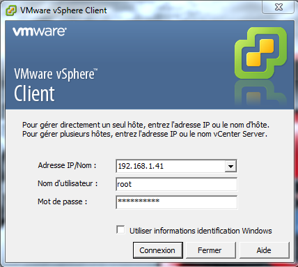 Pour se connecter, indiqué l'IP de votre serveur ESX (192.168.1.41 dans notre cas), ainsi que le mot de passe "root" choisit lors de l'installation.