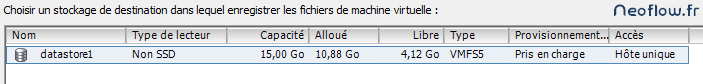 Choisissez où vous souhaitez stocker votre machine virtuelle selon les emplacements de stockages ou les banques de stockage que vous possédez. Si vous avez des emplacements de partage NFS, vous pouvez aussi les ajouter en tant qu'emplacement de stockage pour y placer vos machines virtuelles.