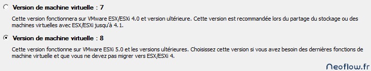 Choisissez la version 8 si vous souhaitez sur votre machine virtuelle bénéficie des dernières améliorations de cette version, mais celle-ci ne sera pas rétro compatible avec les anciennes versions de VMWare ESX/ESXi.