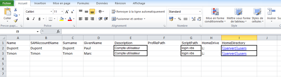 Name;SAMAccountName;surname;givenName;Description;profilePath;scriptPath; HomeDrive;HomeDirectory Dupont;Dupont;Dupont;Paul;Compte utilisateur;;login.vbs;L:;\\server1\users Timon;Timon;Timon;Marc;Compte utilisateur;;login.vbs;L:;\\server1\users