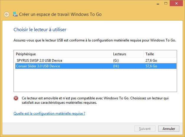 Avant de commencer, je me suis « amusé » à connecter un autre périphérique USB afin de voir le comportement de l’assistant. De ce fait, j’ai connecté une clé USB classique (Corsair Slider 3.0) compatible USB 3.0 et de 64 Go, mais je ne peux pas l’utiliser, pourquoi ? Tout simplement car il s’agit d’une clé USB standard qui n’est pas reconnue comme un disque fixe mais comme un disque amovible.