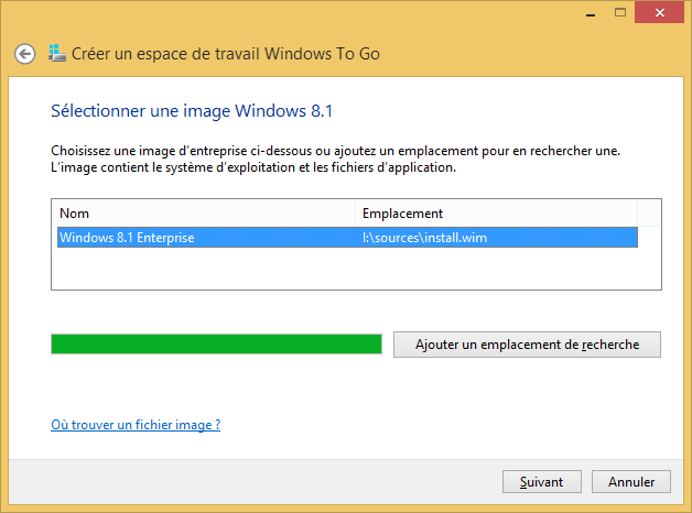 Puisque le fichier ISO est monté dans le système, l’assistant WTG détecte automatiquement sa présence et propose de l’utilisation comme image source. Sélectionnez l’image et cliquez sur « Suivant ».
