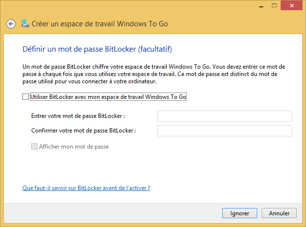 Cochez « Utiliser BitLocker avec mon espace de travail Windows To Go » et indiquez un mot de passe complexe.