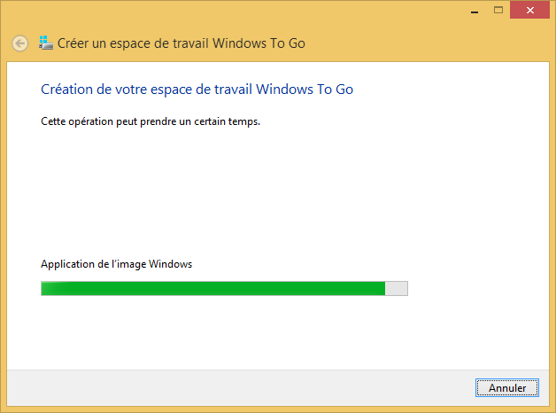 Patientez pendant la création de l’espace de travail. En général, la création d’une clé WTG prend entre 20 et 25 minutes.