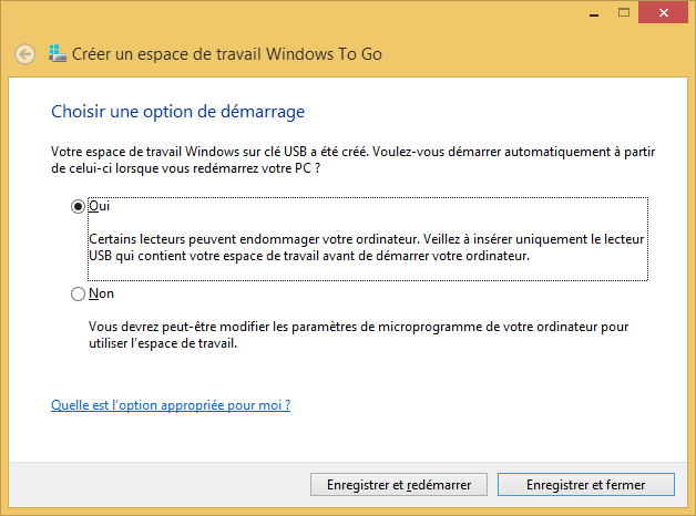 Enfin, la dernière étape et le choix d’une option de démarrage. Choisissez si vous souhaitez ou non démarrer automatiquement sur la clé USB WTG, sinon il faudra modifier le BIOS/UEFI de votre machine pour indiquer que vous souhaitez démarrer sur l’espace de travail WTG (ou passer par le Boot Menu).