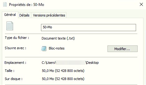 Prenons un exemple. Nous allons créer un fichier de 50 Mo appelé 50-Mo.txt et que l'on va stocker dans le dossier "C:\Temp". Cela donne :