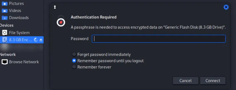 Sous Debian, "dm-crypt" est présent par défaut. Le montage se fait donc dans la plupart des cas directement au branchement de la clé USB. Il vous est alors demandé de saisir votre passphrase dans un pop-up telle que celle-ci :