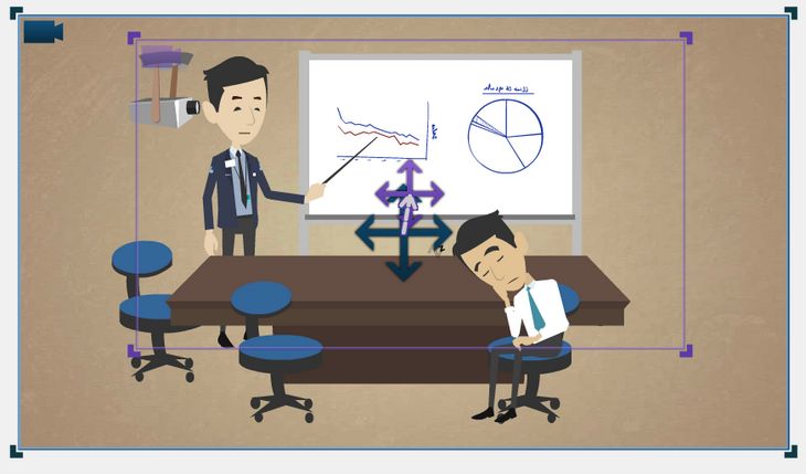Des effets au niveau de la caméra peuvent être également réalisés, comme le zoom sur une partie de la scène, en indiquant le sens de mouvement de la caméra, comme ceci :