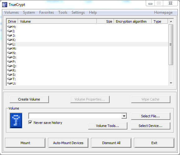 Vous remarquerez que votre clé sécurisée apparait comme vide dans votre poste de travail. Exécutez à nouveau TrueCrypt puis allez dans «Volumes» et «Select Devices…» et sélectionnez la lettre de votre clé.