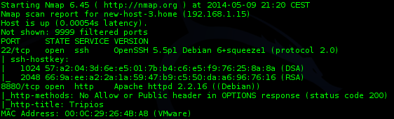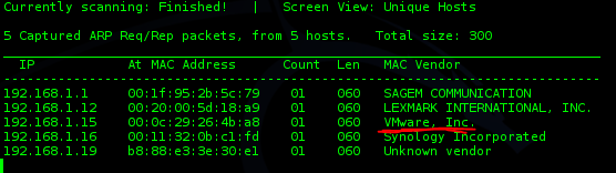 On repère ici plusieurs IP, en trichant un peu on voit donc ma cible qui est virtualisée donc avec une carte réseau VMware, il s'agit de l'IP 192.168.1.15 :