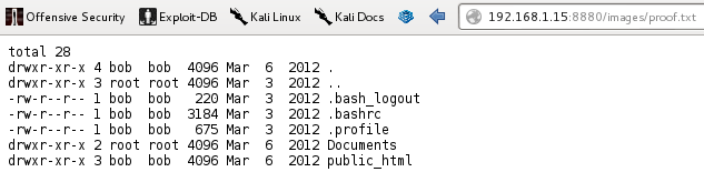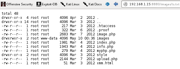 Cela rend la navigation sur le serveur beaucoup plus simple et beaucoup plus rapide. En explorant un peu plus le serveur, j'obtiens quelque chose en envoyant la requête "ls -al ../ > ls.txt". Je vais ensuite lire mon fichier ls.txt :