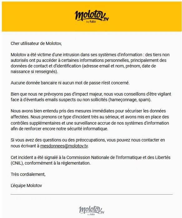 Molotov évoque alors une fuite de données comprenant les adresses e-mail, les noms, les prénoms et les dates de naissance des utilisateurs. Afin de rassurer ses utilisateurs, Molotov précise que "aucune donnée bancaire ni aucun mot de passe n’est concerné".