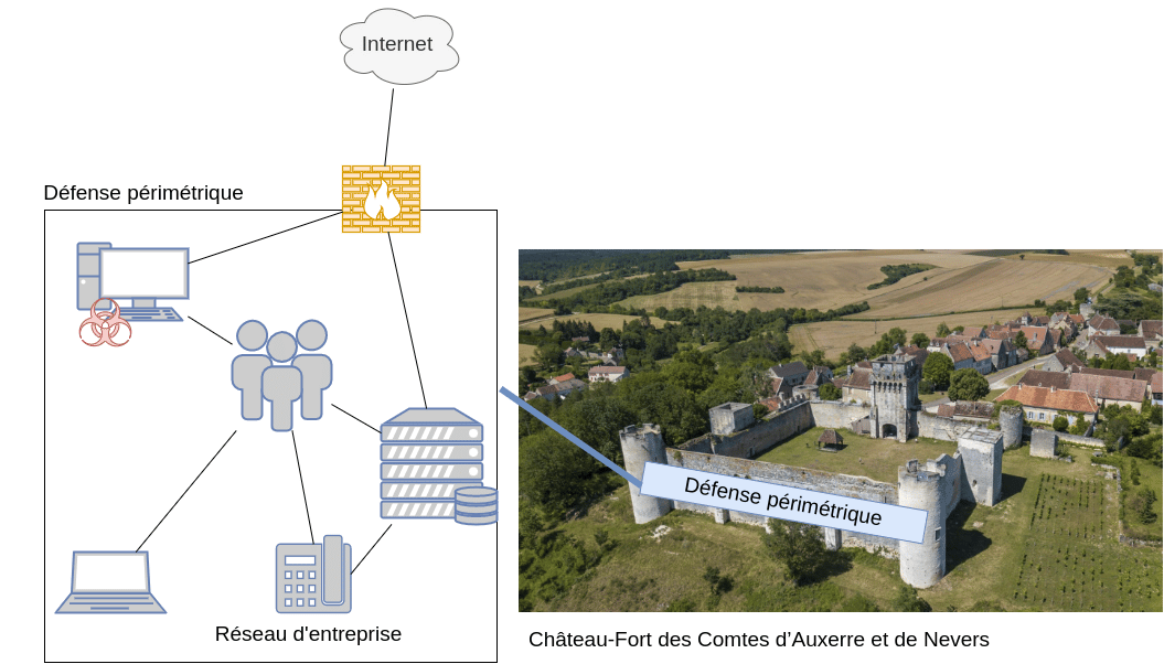 Dans le domaine de la cybersécurité, ce principe de multiples barrières est également valable. La vision de la défense périmétrique reste importante et non négligeable, mais elle apparaît comme lourdement insuffisante pour défendre un système d'information moderne :