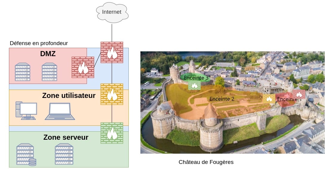 Au Moyen-âge, l'assaillant ayant capturé l'enceinte 1 du château de Fougères n'était qu'au début de son périple, il lui reste à passer le pont-levis menant à l'enceinte 2, la porte protégée par une herse, traverser l'enceinte 2 sous le feu ennemi puis atteindre l'enceinte 3 par une petite porte bien gardée pour ensuite tenter de monter les différents étages du donjon. Il n'était donc qu'au début de son assaut. Aujourd'hui, un attaquant ayant compromis un serveur dans le DMZ (un site vitrine exposé sur Internet par exemple) doit également franchir plusieurs barrières défensives pour atteindre le contrôleur du domaine ou le serveur de fichier (quand la défense en profondeur est bien implémentée :)).